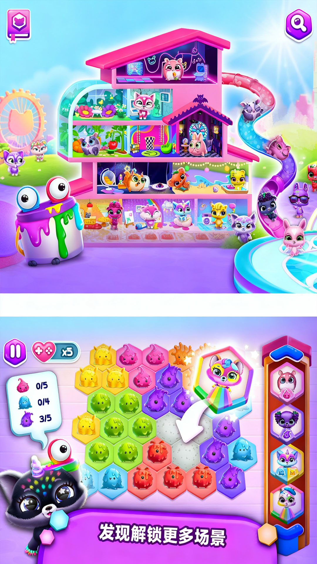 1、结合色彩鲜艳的画面与轻松休闲的节奏,吸引玩家通过消除解锁萌宠、探索剧情;