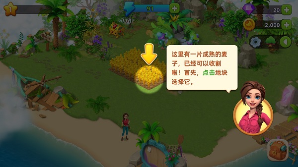 这里是农场,上面已经有一片成熟的麦子,你可以点击地块完成收割工作。