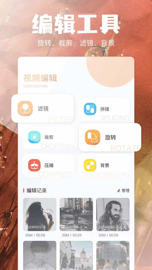 2、本地视频编辑工具齐全,支持滤镜、拼接、裁剪、旋转、压缩、添加背景的功能。