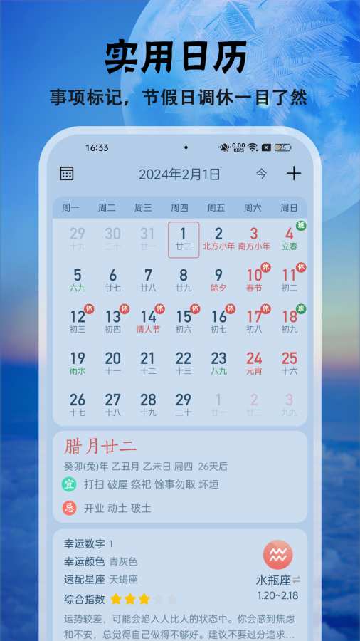 3、月视图、周视图、3日视图、日视图、黄历宜忌、节假日查询、日程、生日、纪念日等功能。