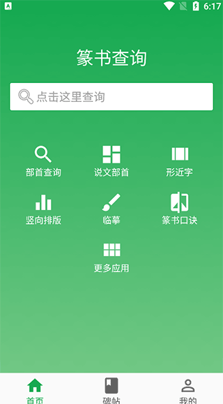 1、打开软件,首页不仅可以对篆书进行查询,还可以通过部首进行查询,在这里用户还可以对篆体字进行临摹,软件还为部分用户提供篆书口诀,让大家轻松学好篆体字;